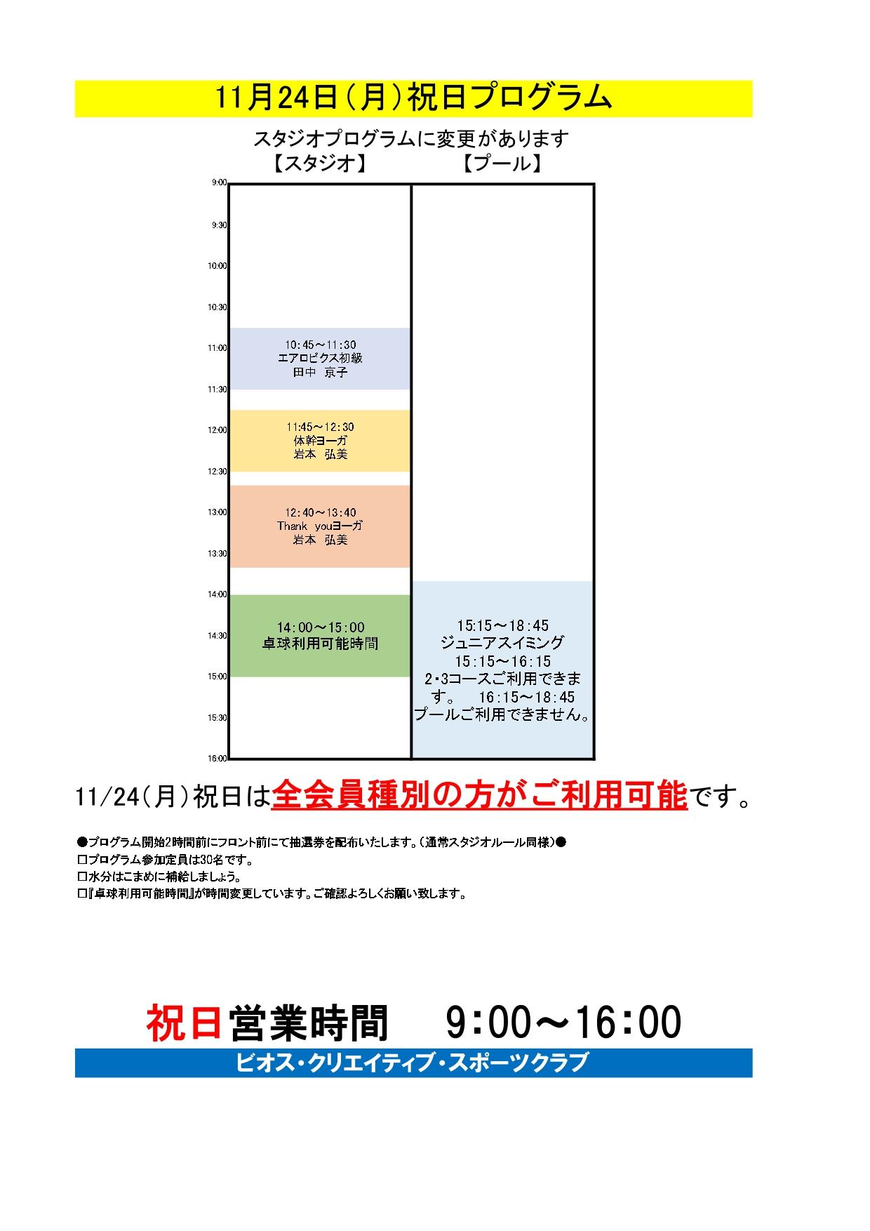 11月24日(月)祝日プログラムのお知らせ