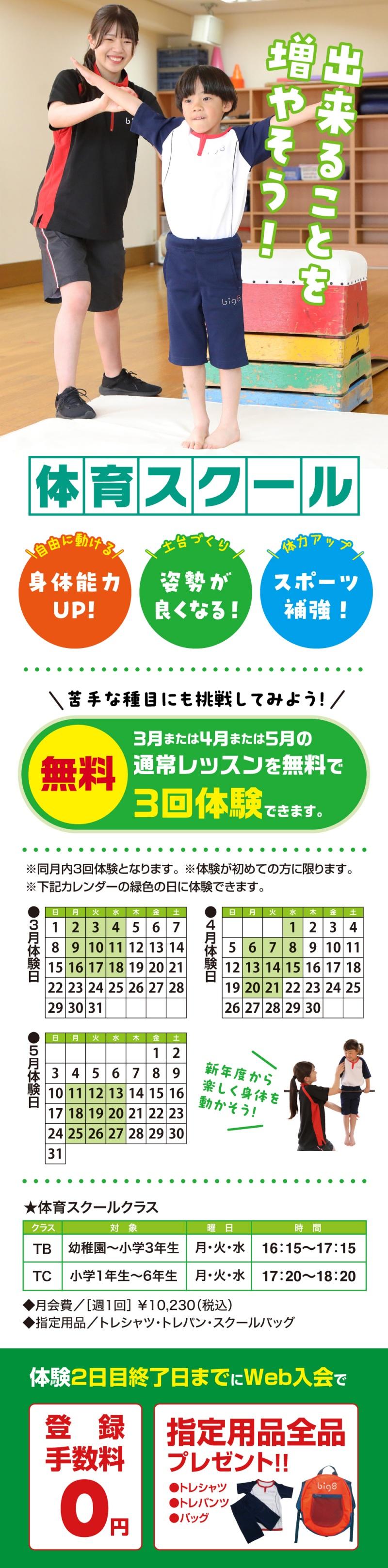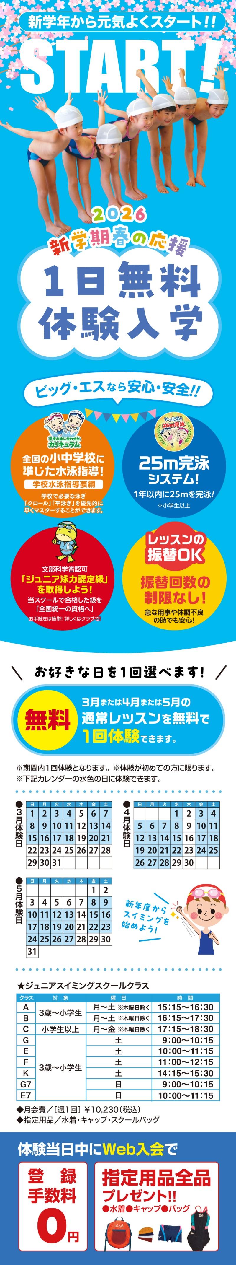 ビッグエス千城台では、3月~5月で各スクールにて体験レッスン受講生を募集します!!