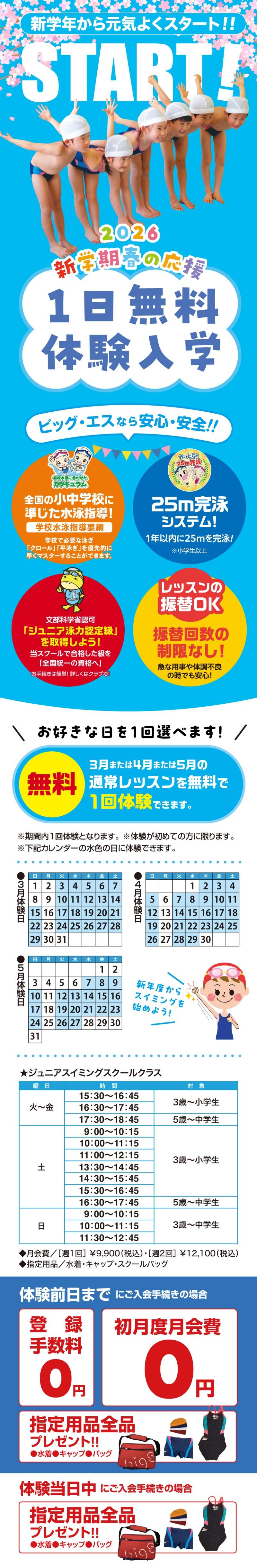 ビッグエス大日では、3月~5月で各スクールにて体験レッスン受講生を募集します!!