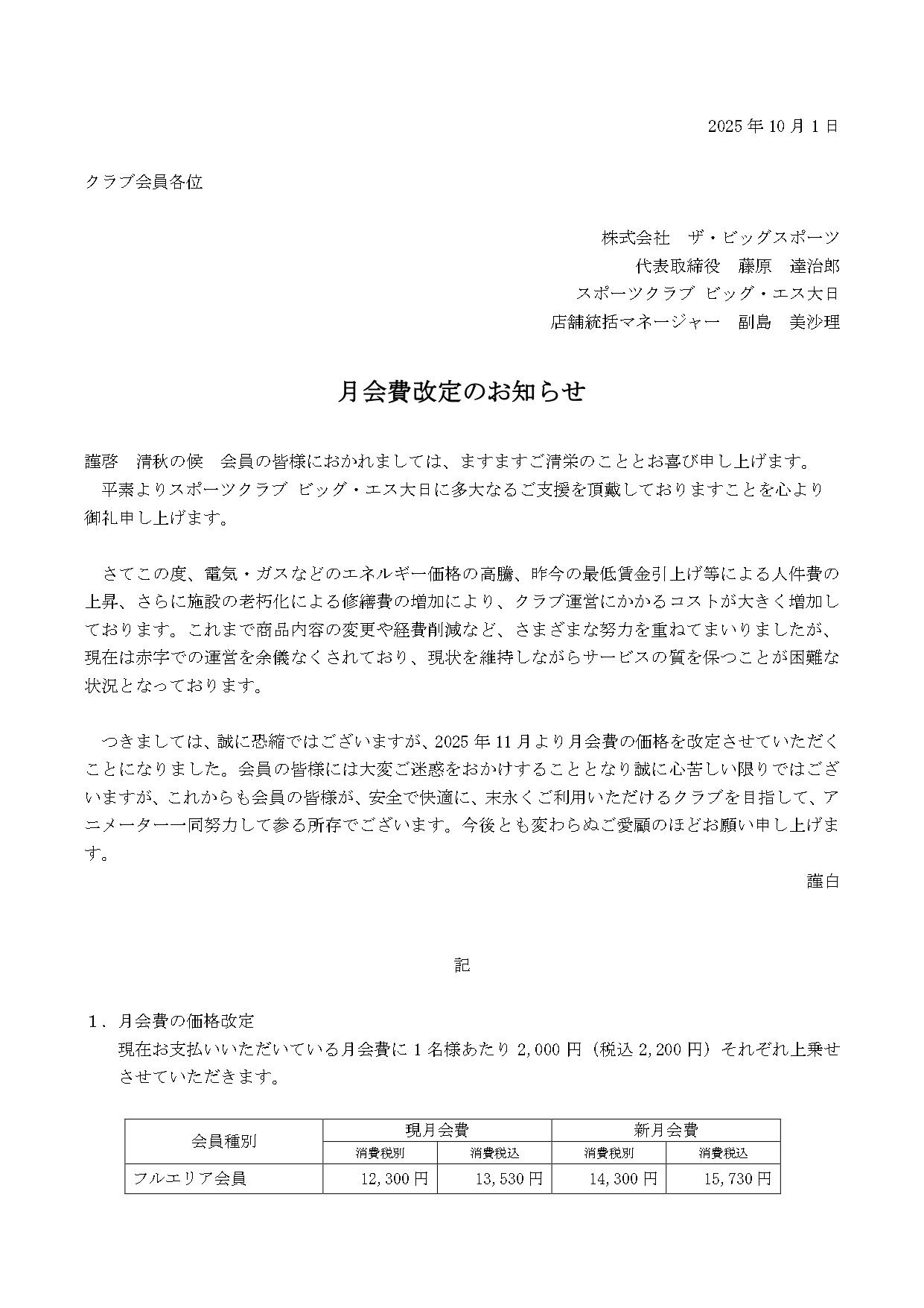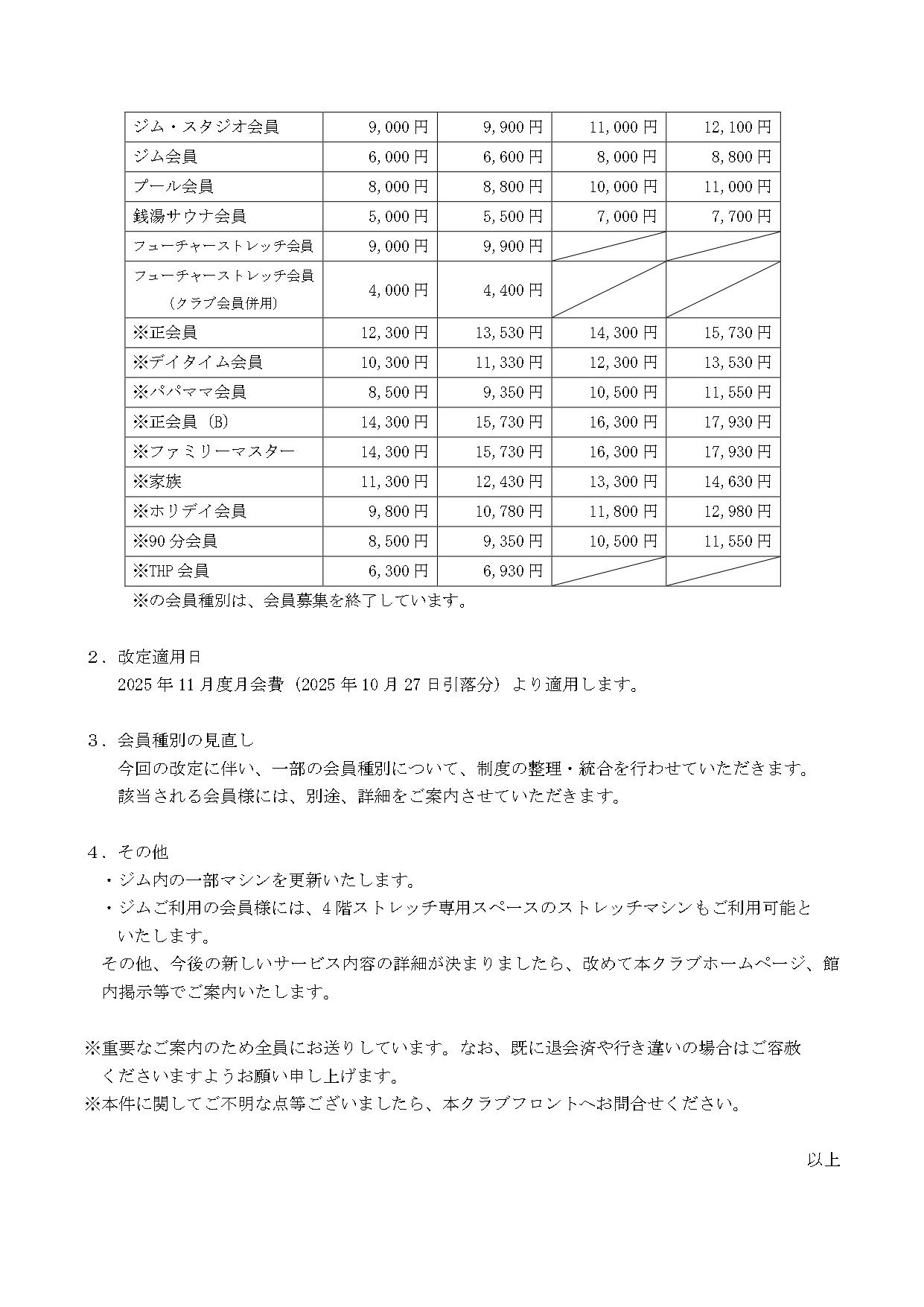 【重要】月会費改定(スポーツクラブ)のお知らせ