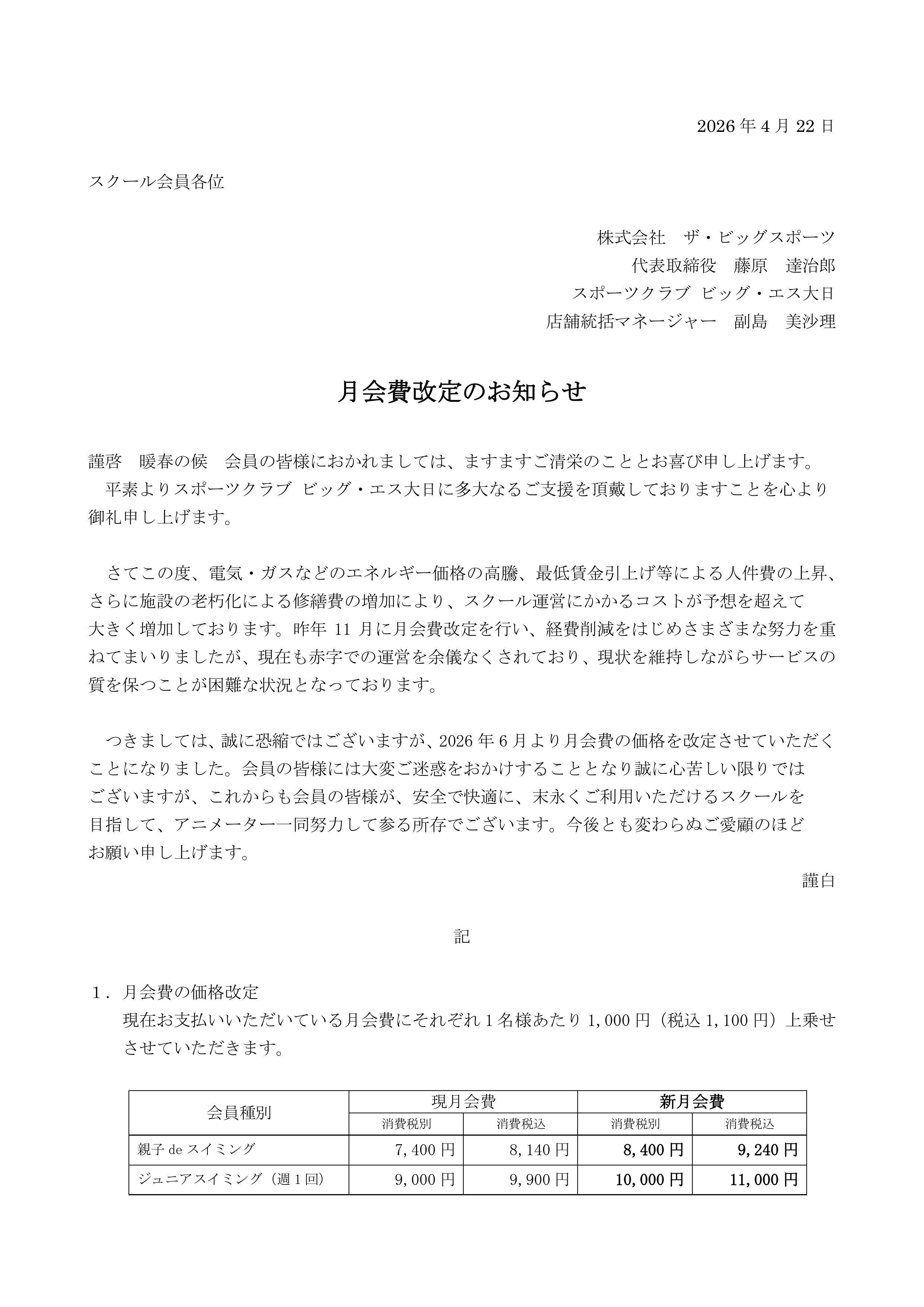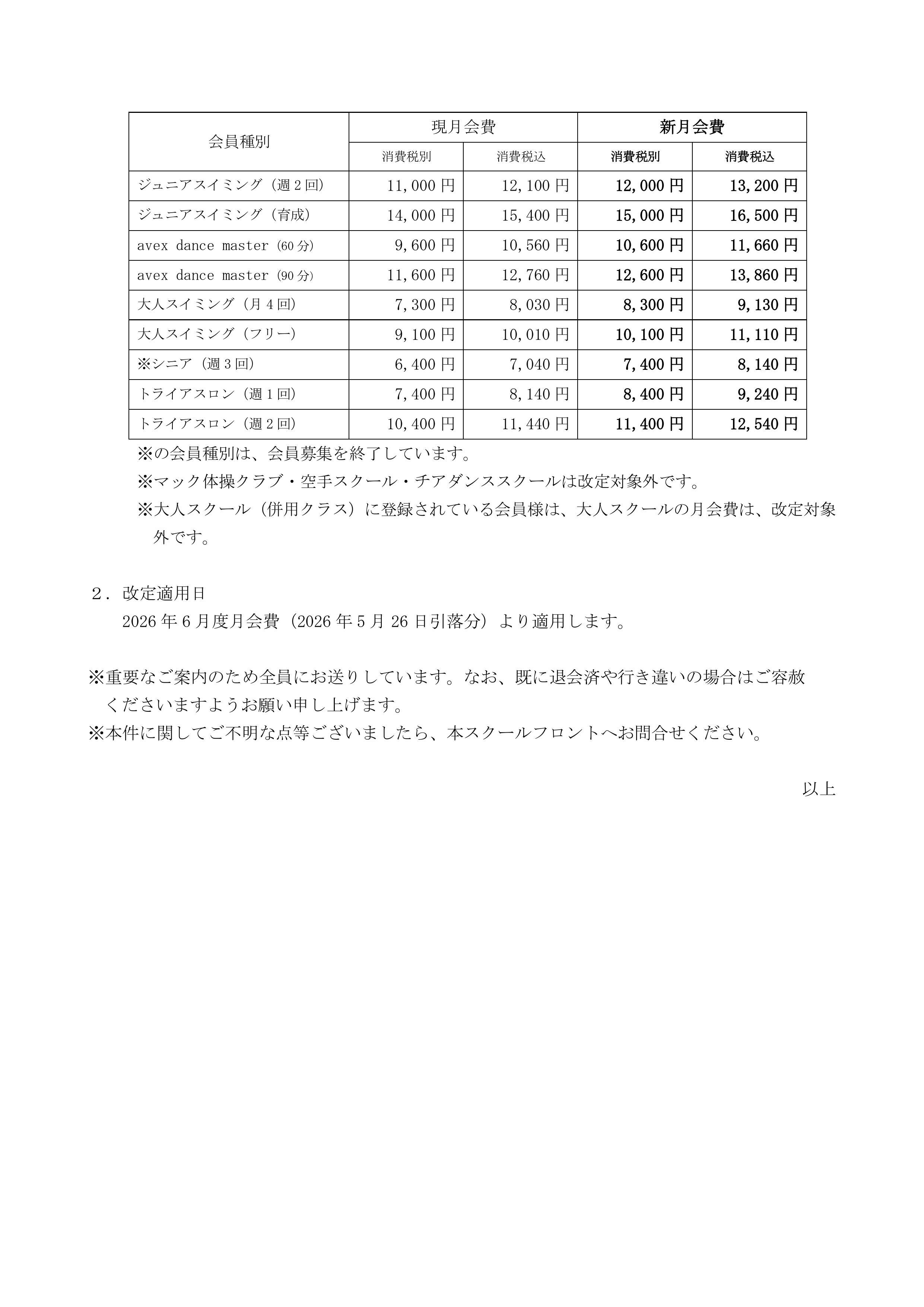 【重要】月会費改定(スイミング・avex・成人スイミング・トライアスロンスイム)のお知らせ