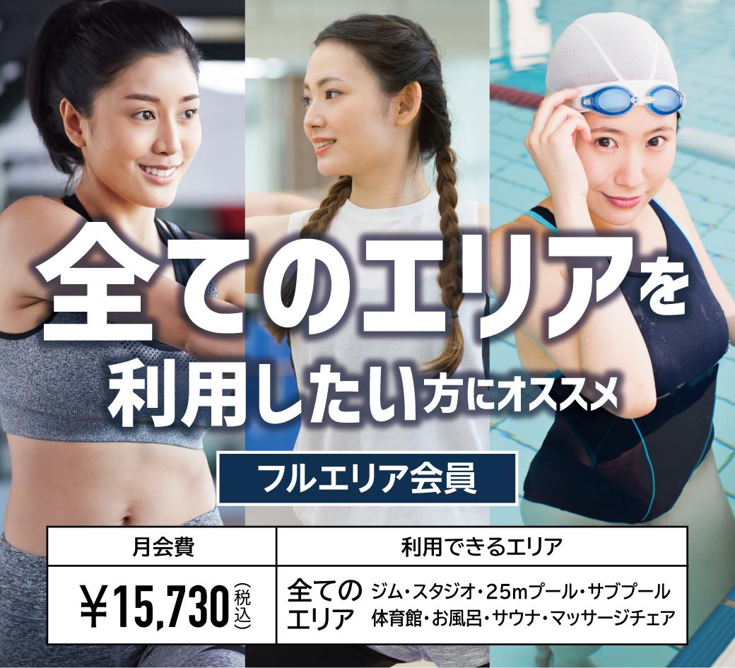 ジムエリア・スタジオ・25mプール・大人専用サブプール・体育館・お風呂・サウナ・マッサージチェア