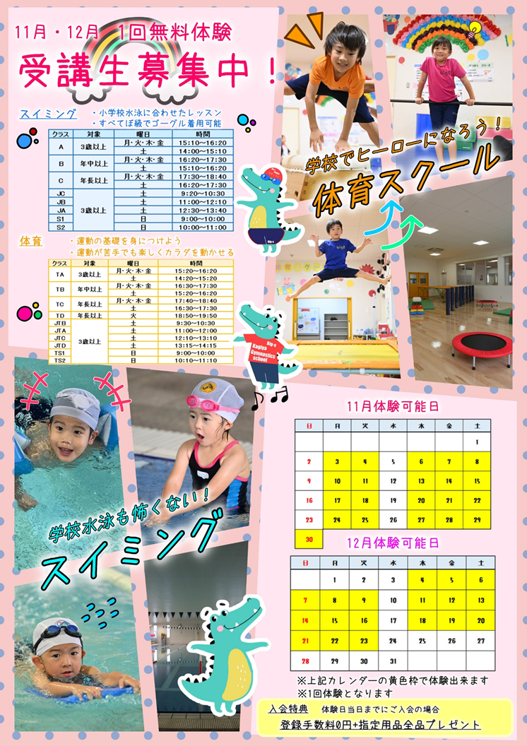 ビッグ・エス加木屋では、11月・12月ジュニアスイミング・体育スクールの通常レッスン1回無料体験会の申込受付中です。
