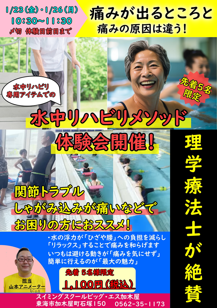 1/23(金)・1/26(月)10:30~11:30に体験会を実施いたしますので、ご希望の方は体験日前日までにビッグ・エス加木屋までご予約をお願いいたします。