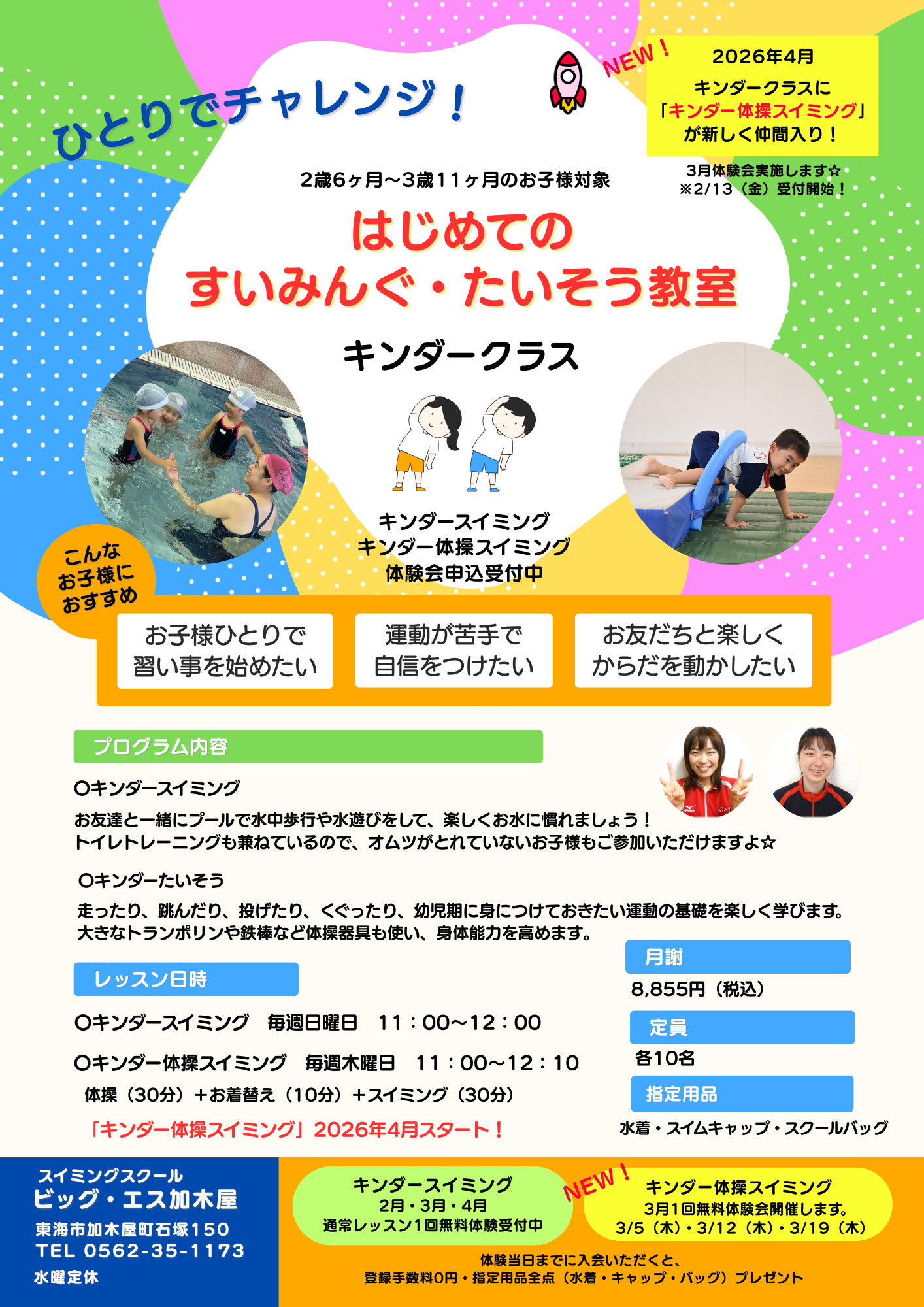 「キンダー体操スイミング」は毎週木曜日の実施となり、3月からは体験会も行いますよ☆