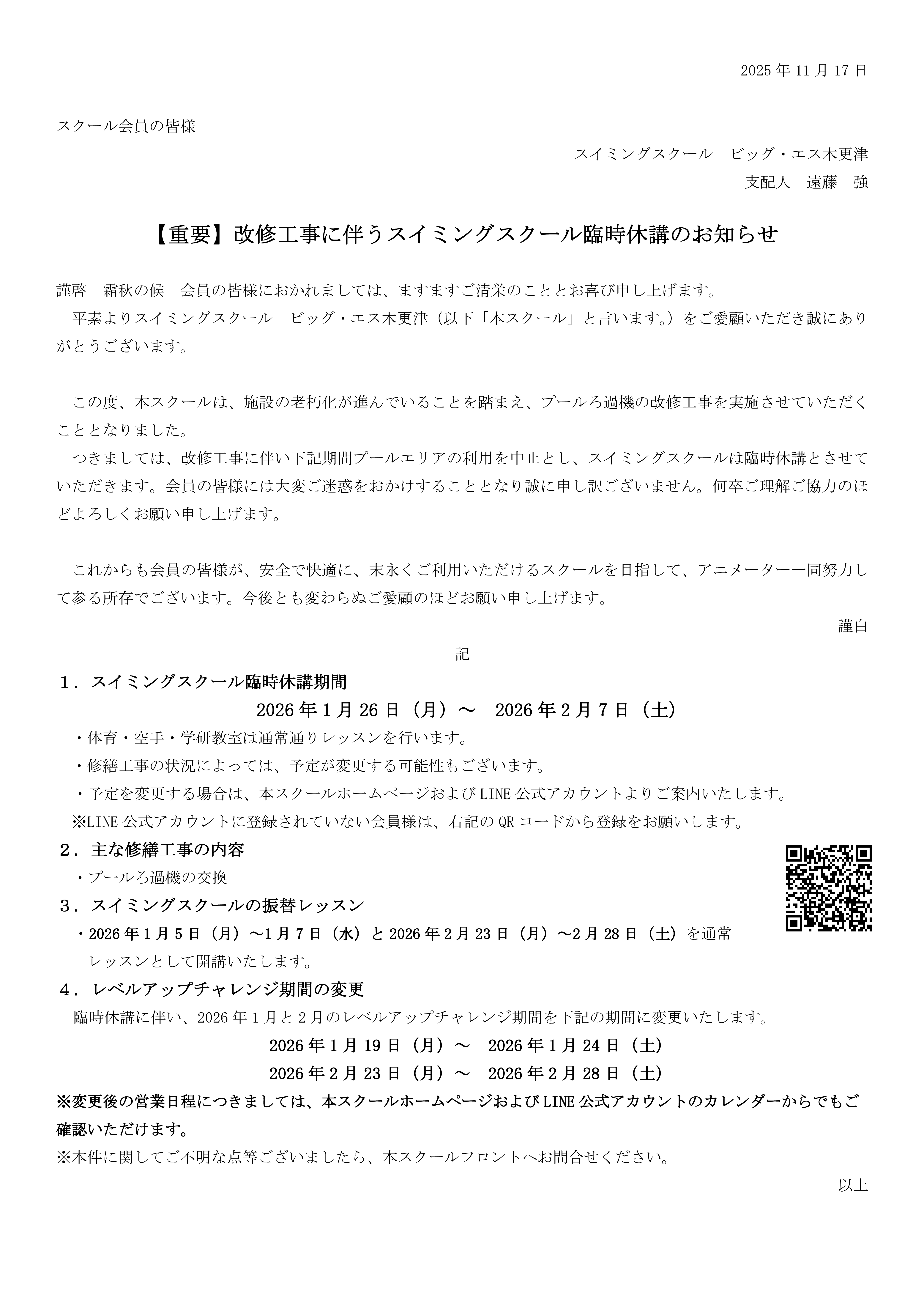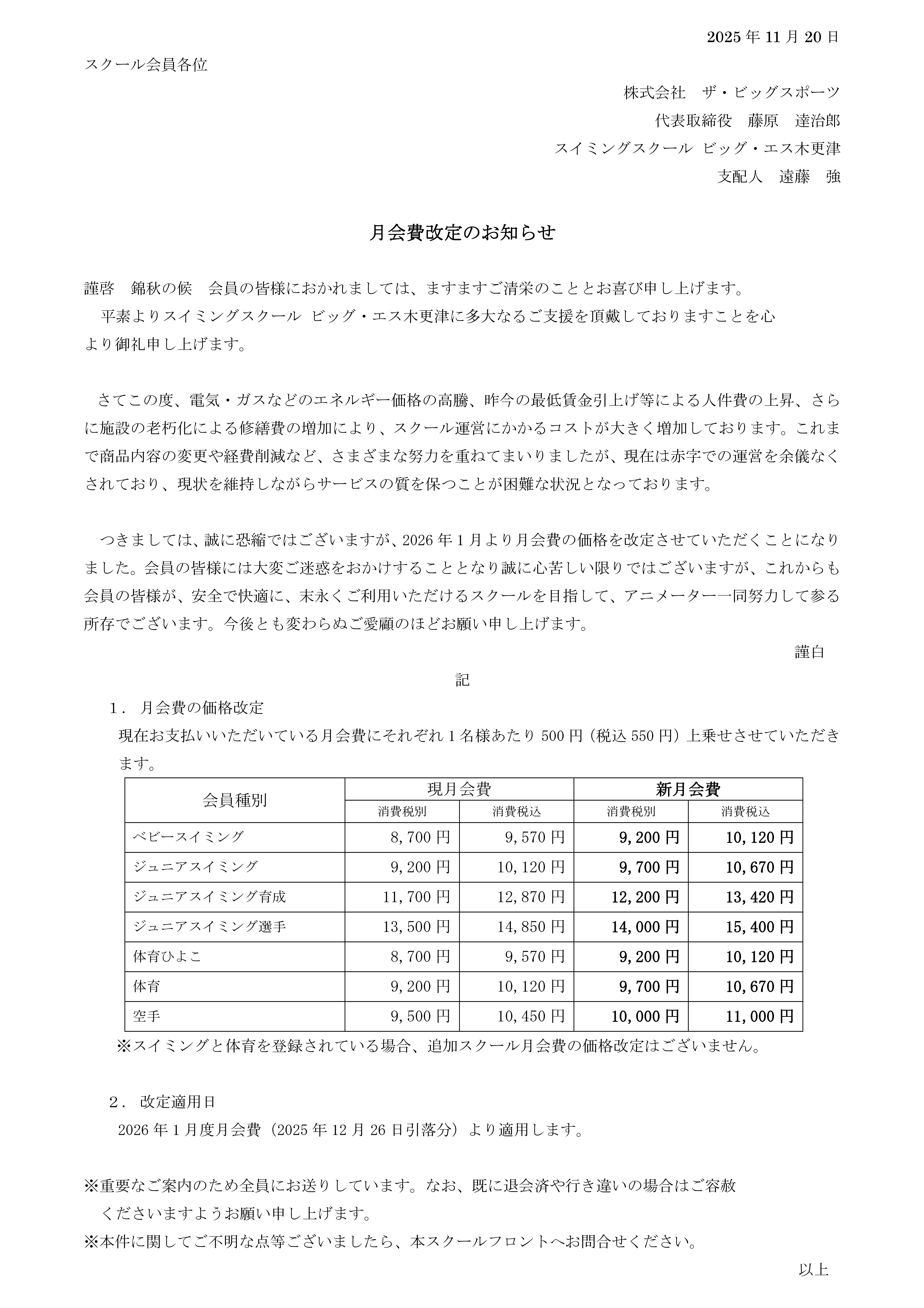 【重要】※ジュニアスクール会員様※ 月会費改定のお知らせ・プールエリア改修工事のお知らせ