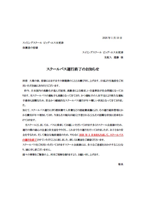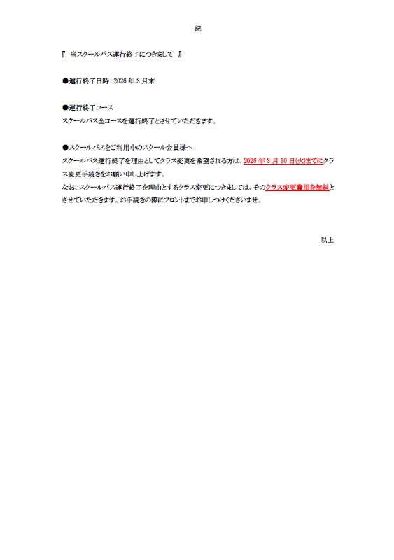 【重要】※ジュニアスクール会員様※ スクールバス運行終了のお知らせ
