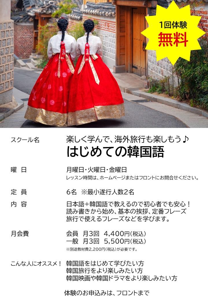 大好評の「はじめての韓国語スクール」ですが、新クラスを開講いたします!