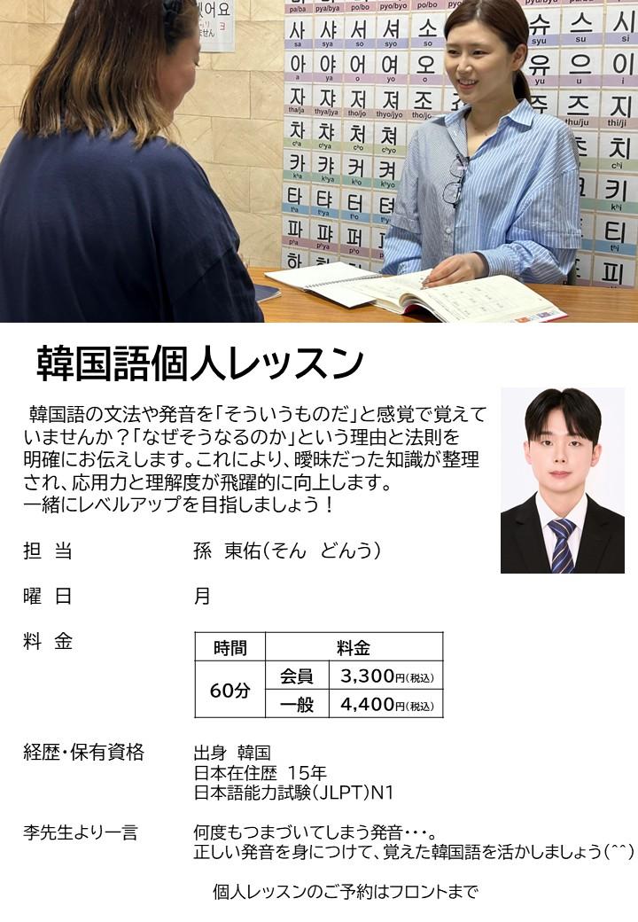 孫先生は、韓国語は当然ですが、日本人の私より日本語の発音等に詳しいです!兵役に行かれるまでの期間限定ではありますが、とても熱心にわかりやすい教えてくれます!