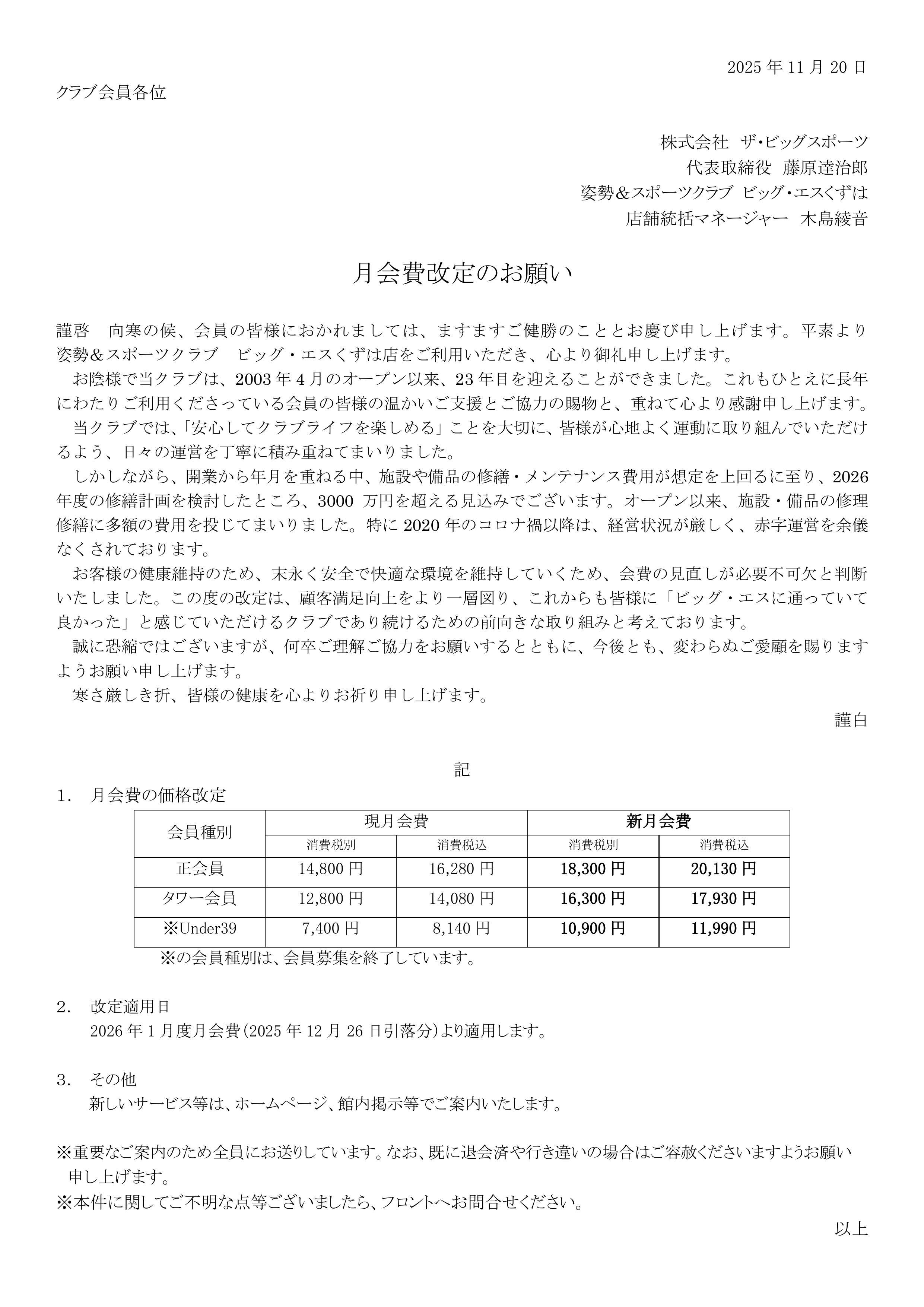 【重要】月会費改定のお願い