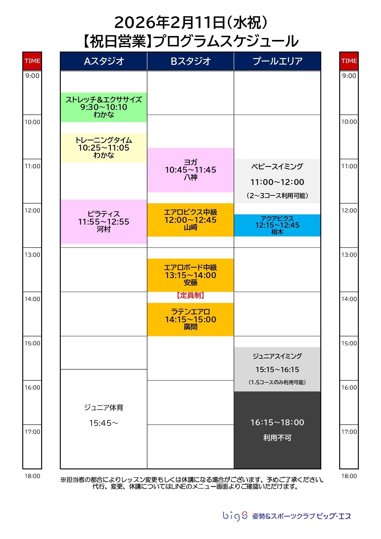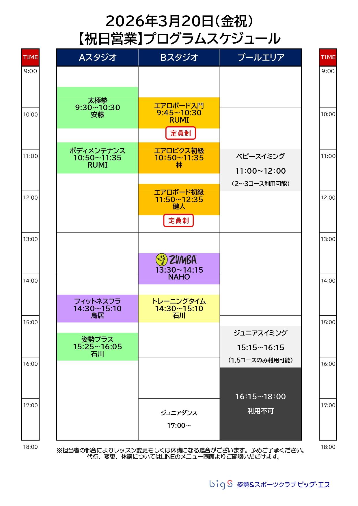 プログラム代行・変更・休講のお知らせ