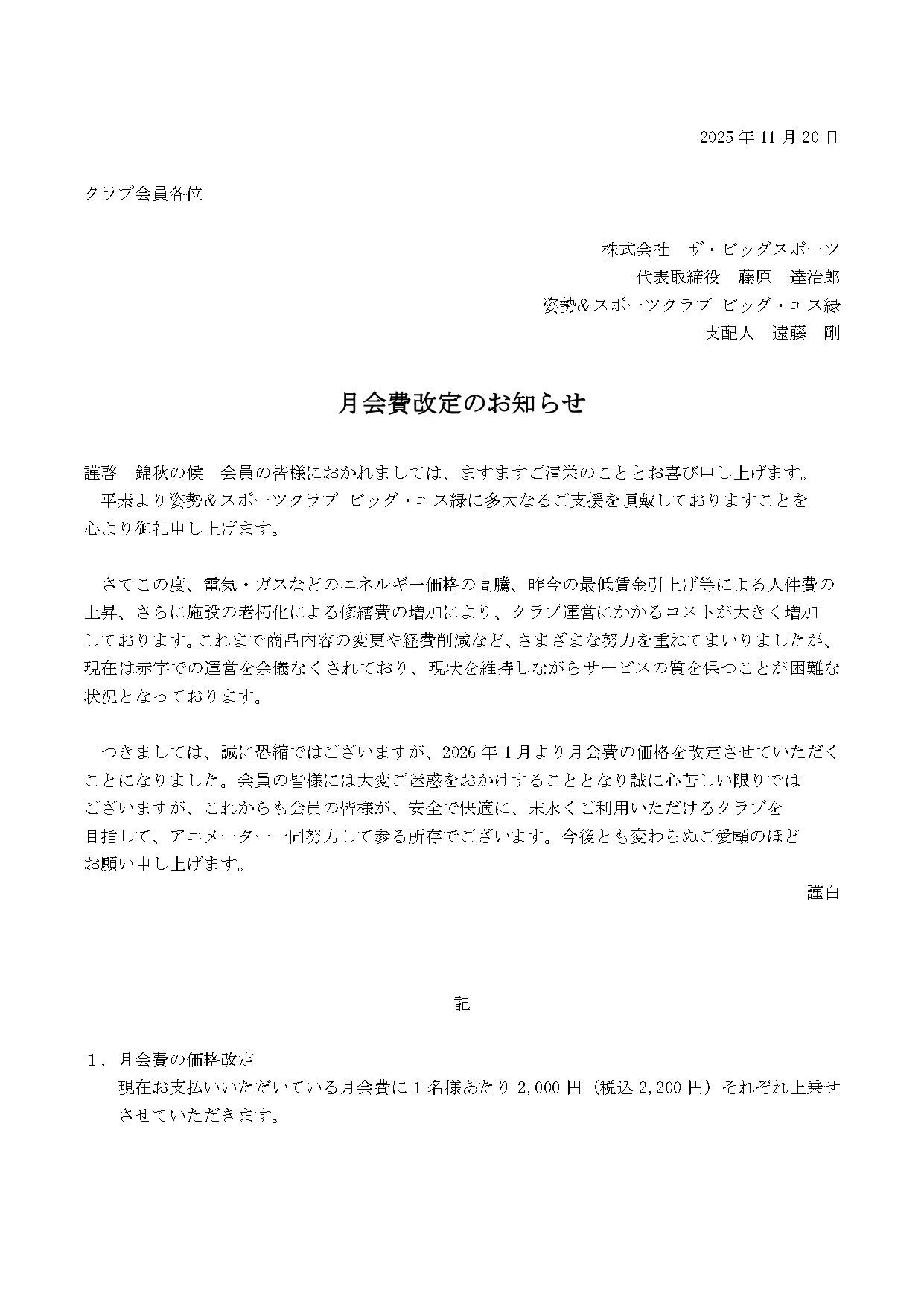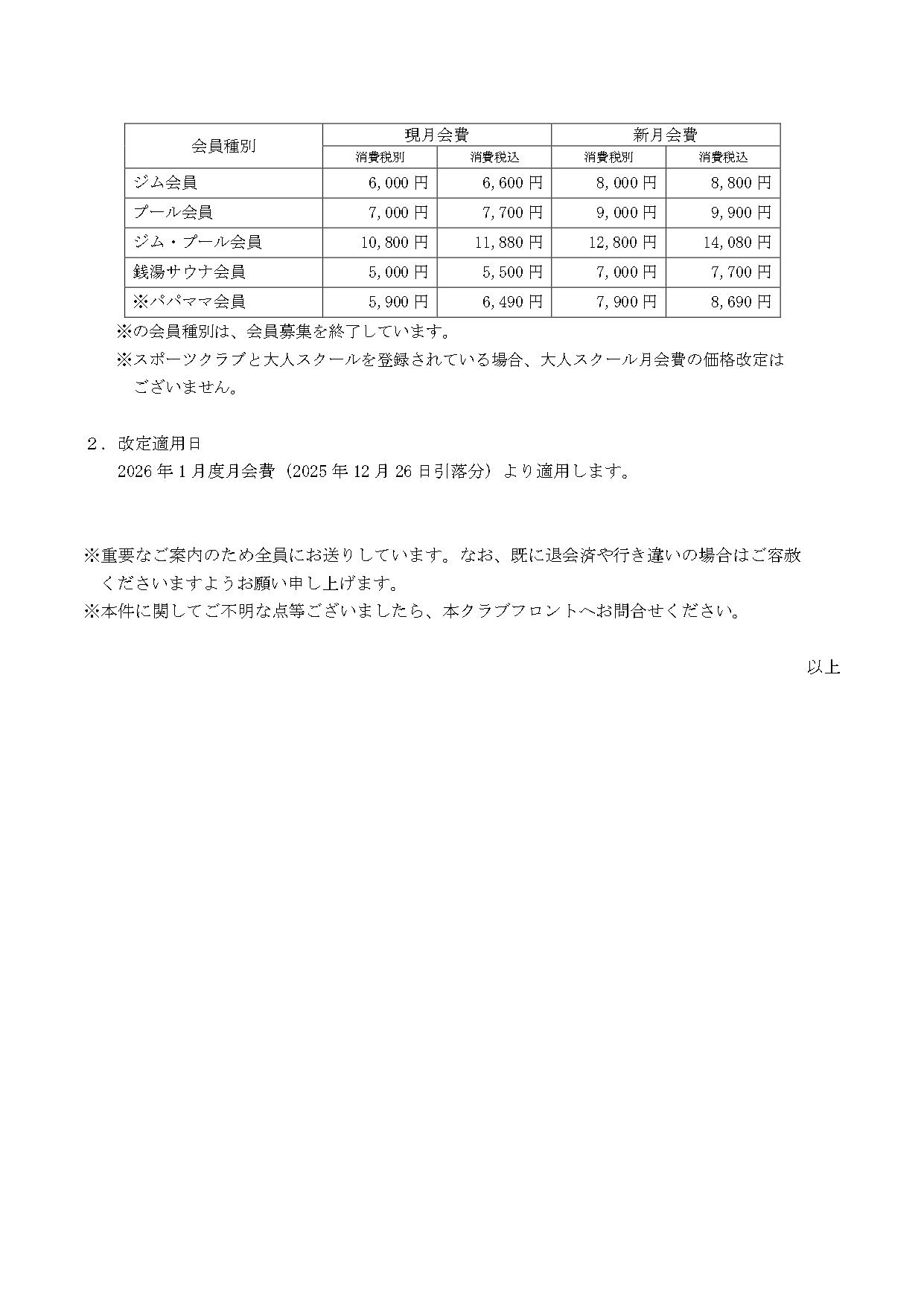 【重要】月会費改定(スポーツクラブ)のお知らせ