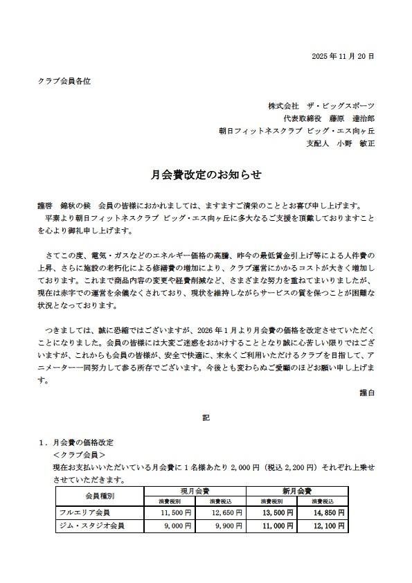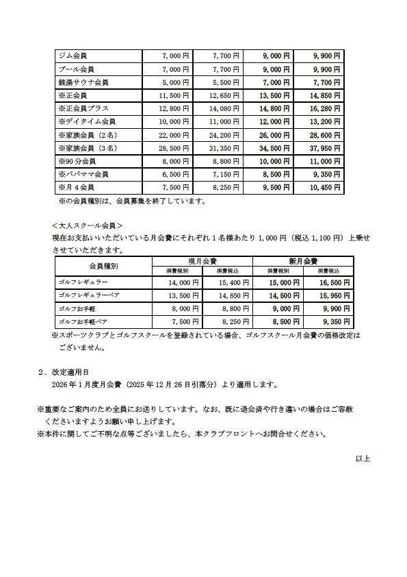 【重要】月会費改正(フィットネスクラブ・ゴルフスクール)のお知らせ