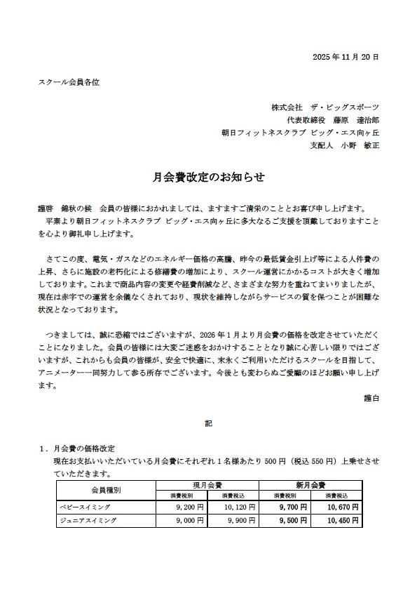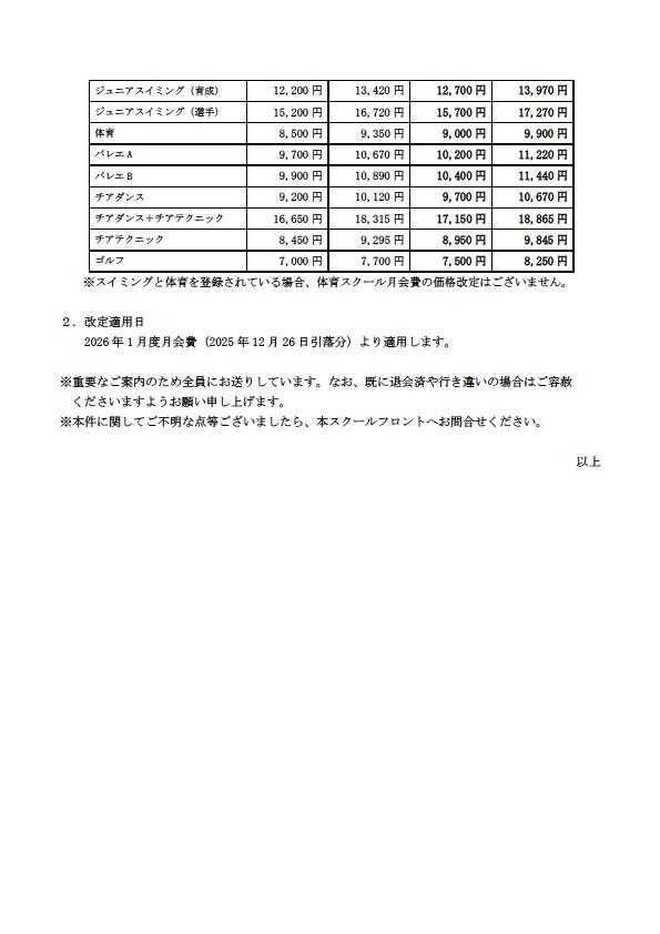 【重要】月会費改正(ジュニアスクール)のお知らせ