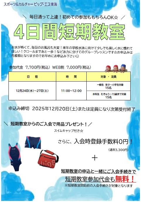 東海市・大府市・知多市・常滑市・阿久比町・名古屋市でお子様向けスイミングスクールをお探しの保護者様へビッグ・エス東海短期水泳教室のお知らせです!