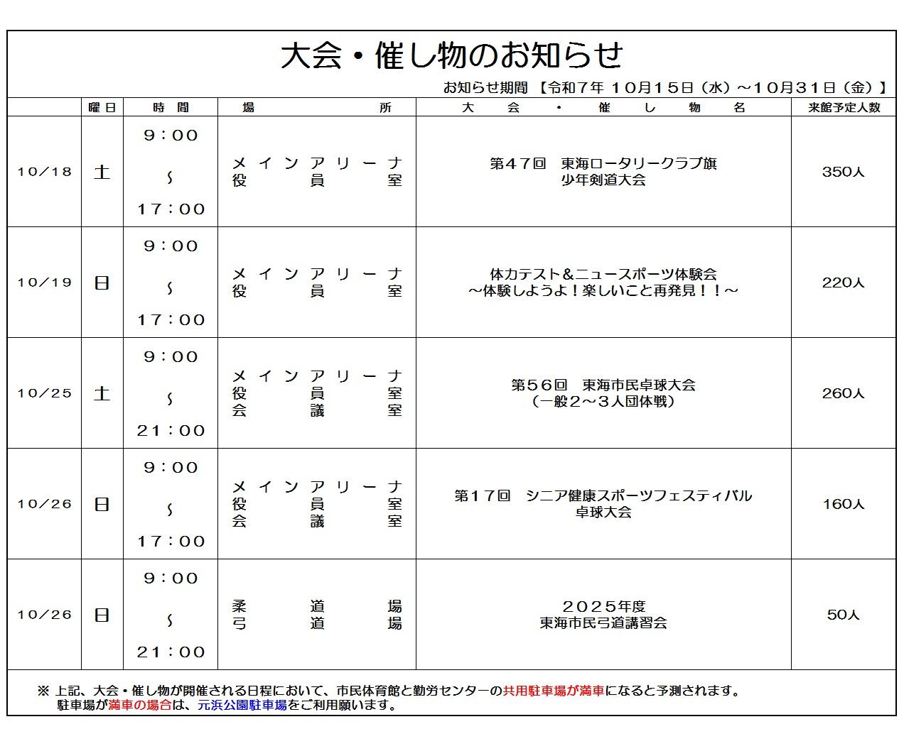【大会・催し物のお知らせ 期間:10月15日(水)~10月31日(金)】