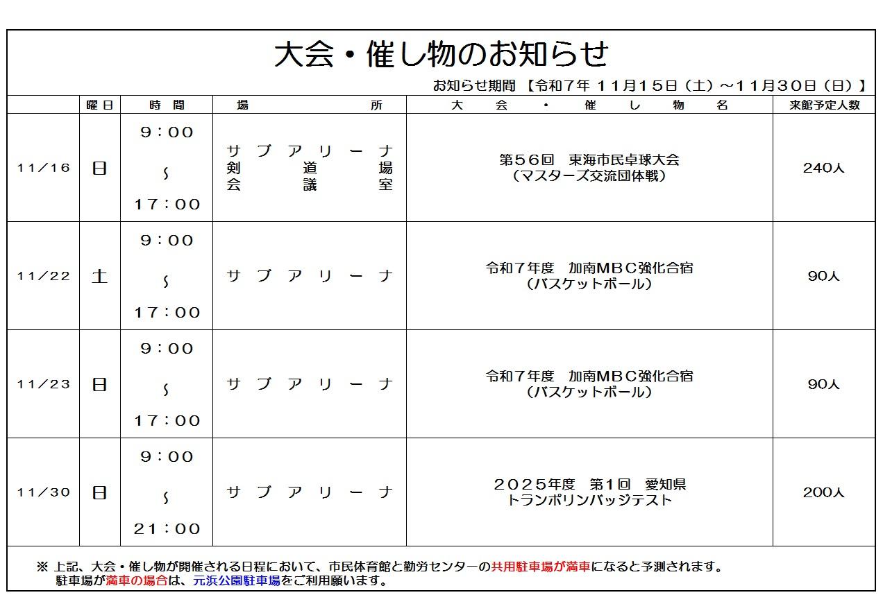 【大会・催し物のお知らせ 期間:11月1日(土)~11月14日(金)】