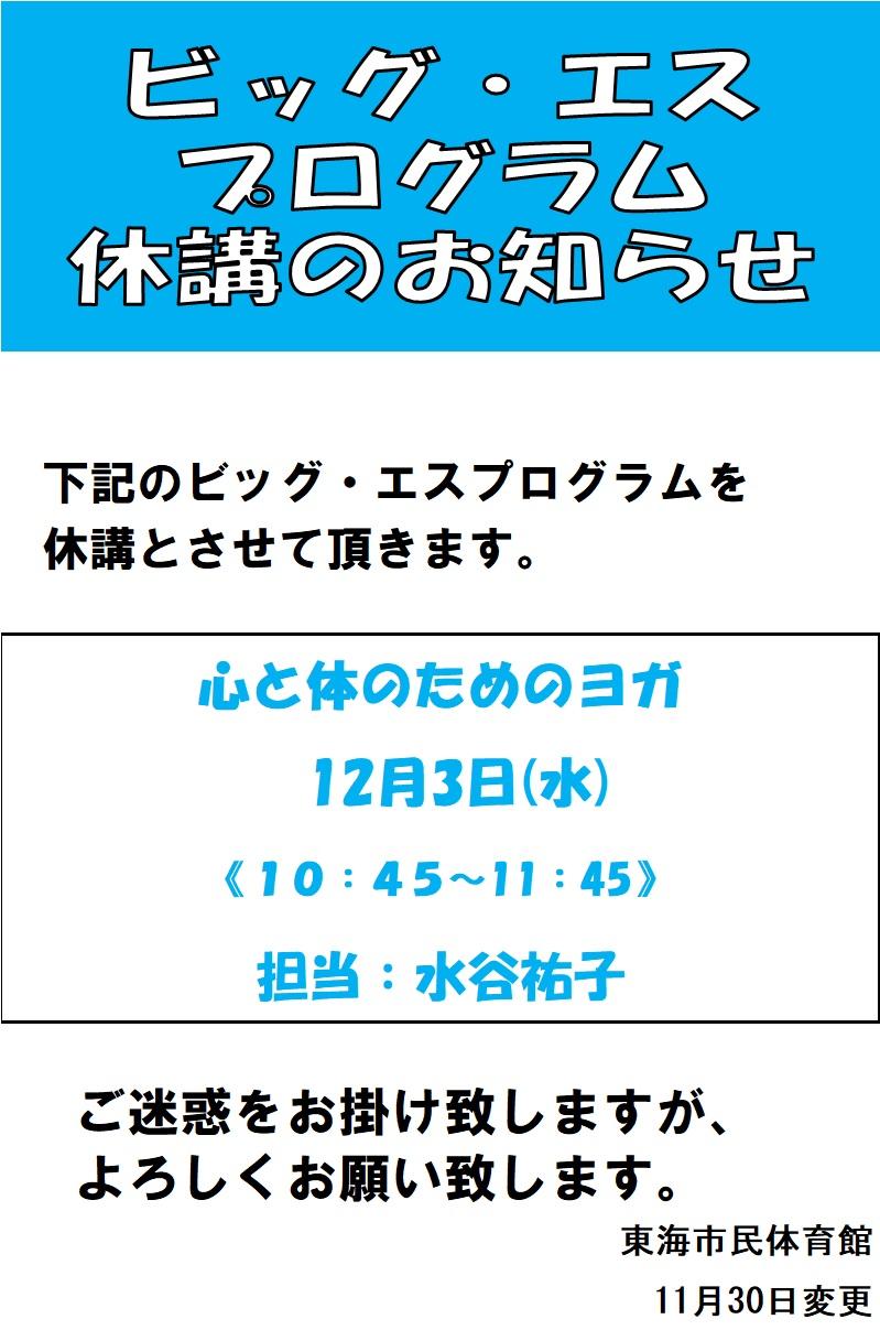 12月3日 ビッグ・エスプログラム 心と身体のためのヨガ は休講となります。