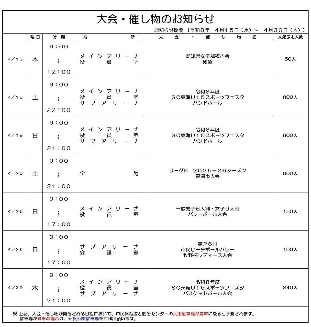 【大会・催し物のお知らせ 期間:4月15日(水)~4月30日(木)】