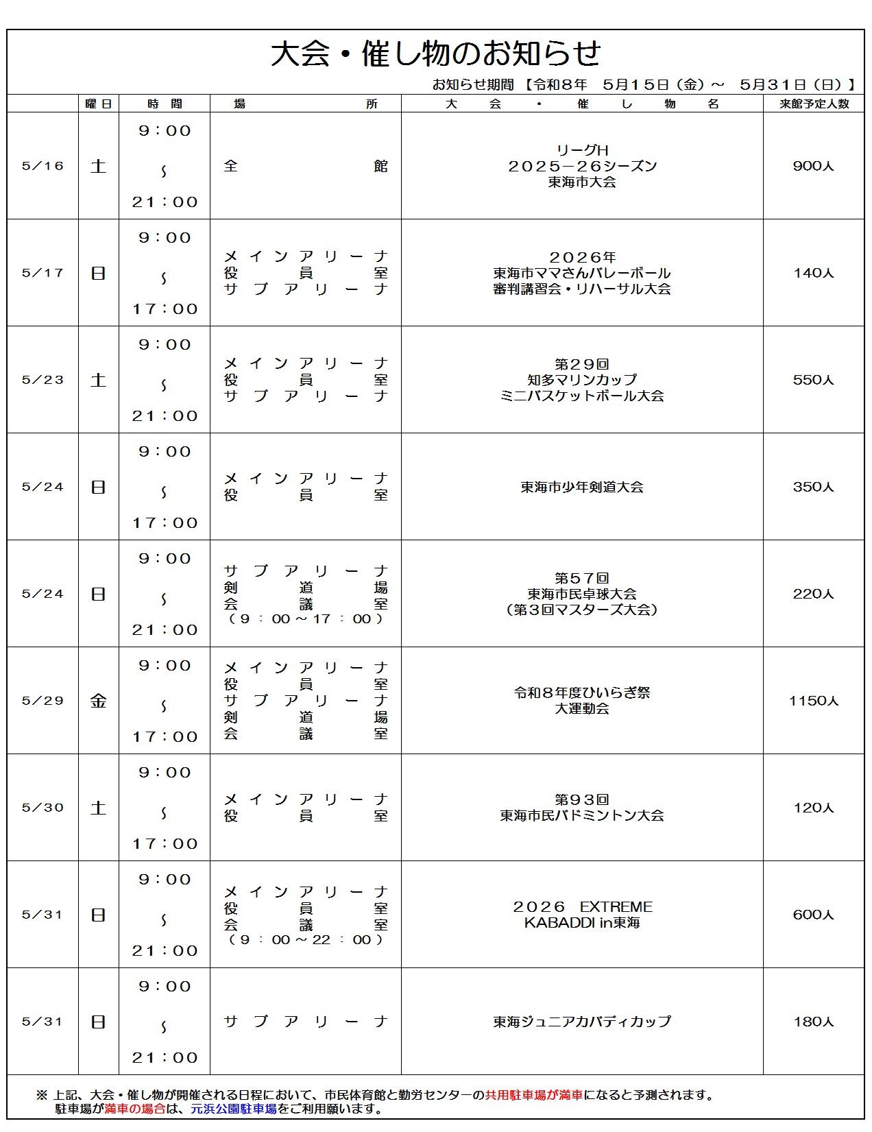 【大会・催し物のお知らせ 期間:5月15日(金)~5月31日(日)】
