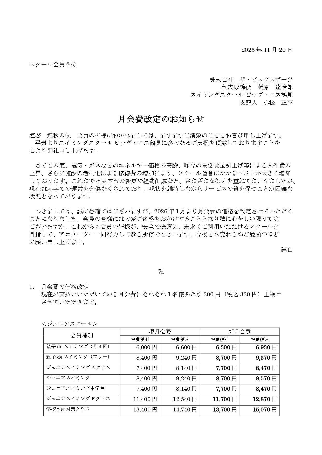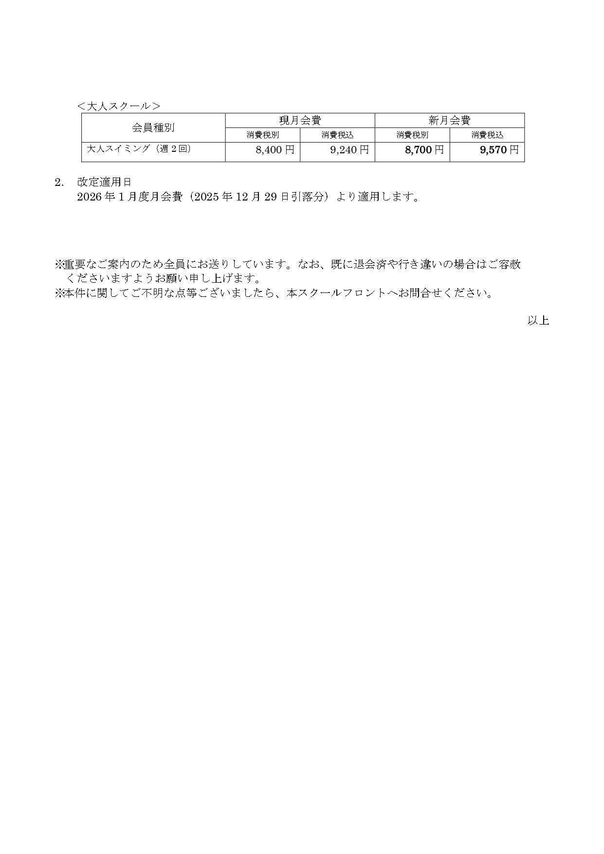 月会費改定のお知らせ(ジュニア・大人スクール)